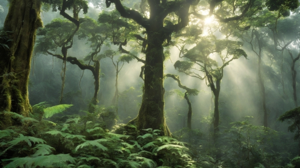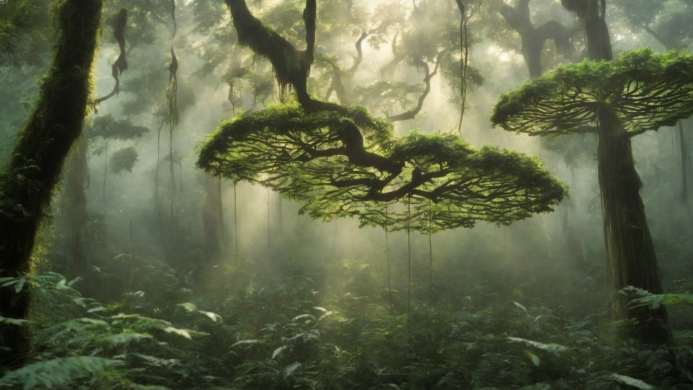 Atmospheric Effects: To enhance the sense of depth and atmosphere, the digital art employs subtle layers of mist and fog that recede into the distance, creating a sense of mystery and scale. Sunbeams pierce through the canopy, illuminating patches of the forest floor and highlighting the intricate details of the surroundings.